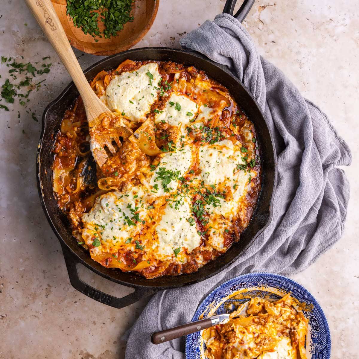 Want that melty, golden lasagna top without baking a full pan? Finish your skillet lasagna under the broiler for a few minutes. It gives the mozzarella that bubbly, browned finish—no need to turn on the oven for an hour!